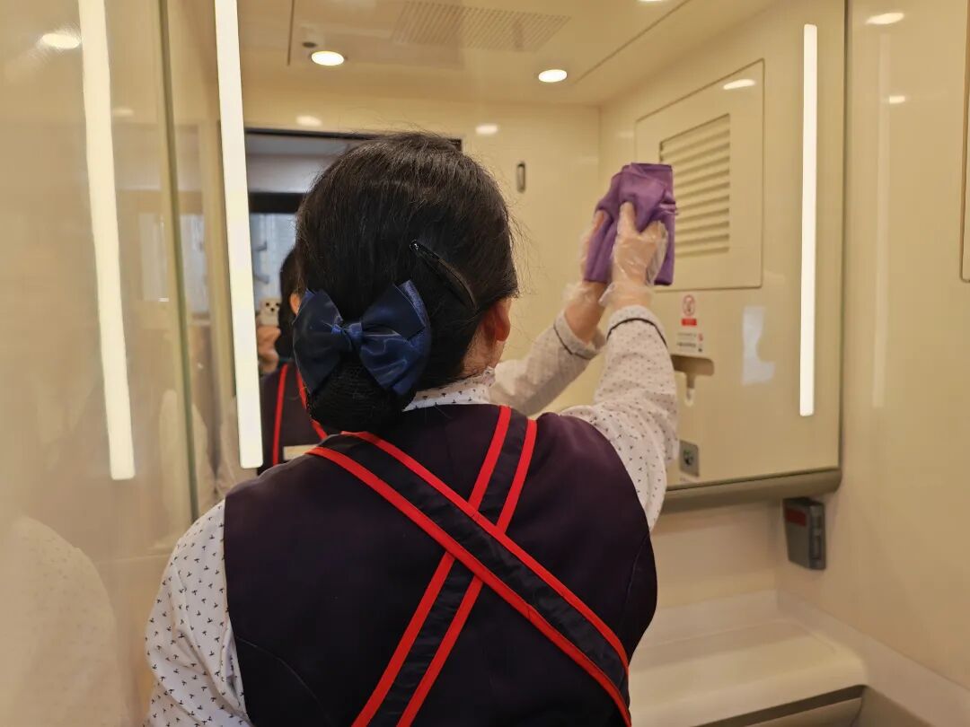 保洁工作看似琐碎,却藏着对旅客的细心呵护。看到老年旅客忘记锁闭残疾人卫生间,他们会静静守候在门口,避免尴尬发生;发现垃圾桶盖有油渍,会立刻用消毒水擦拭干净,让旅客放心投放;遇到醉酒旅客呕吐在车厢,即便内心不适,也会一遍遍用专用抹布擦拭消毒,直到异味散尽。“有人觉得我们的工作没技术含量,但能让旅客在干净的环境里回家,就是最大的价值。”赵彩平已经在这个岗位上坚守了十五年,春运期间,她每天都是坚持频繁在车上做到随脏随清工作,也从未懈怠。