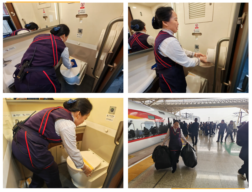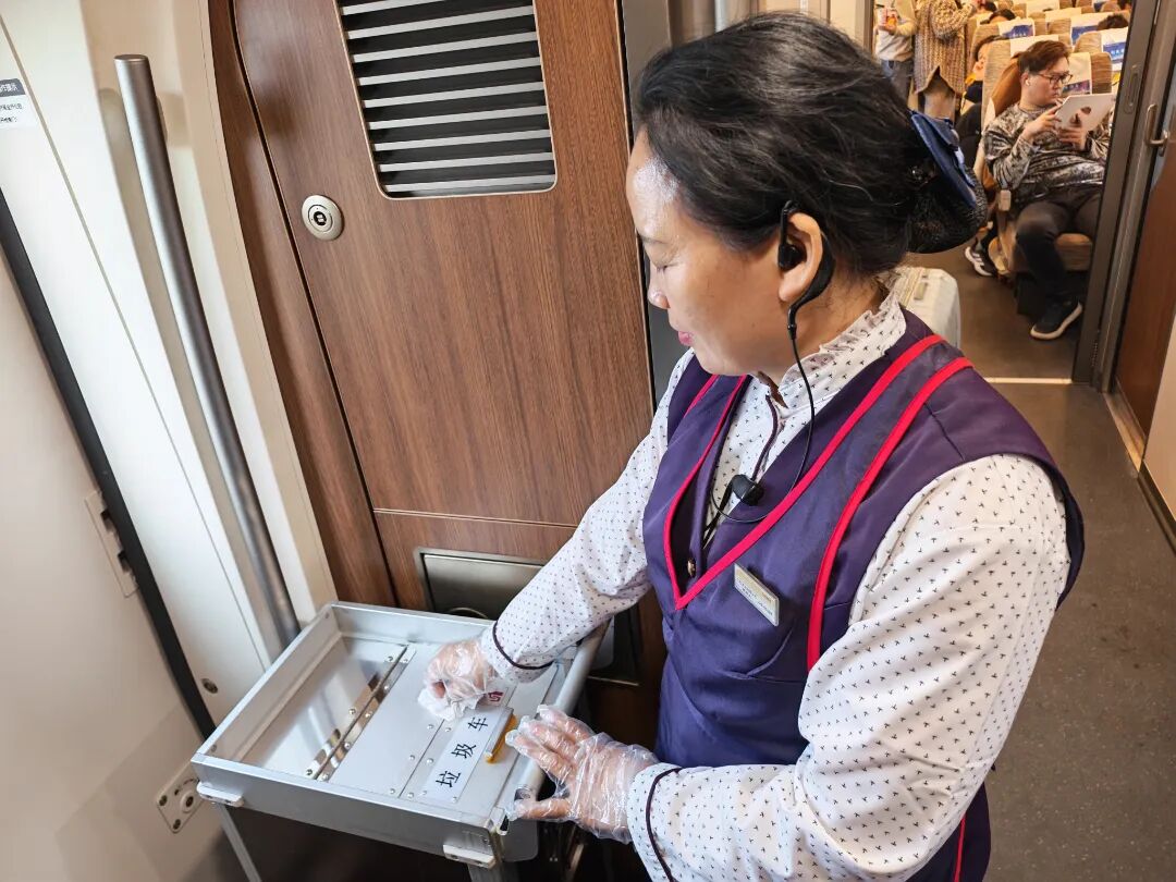 上午8时,满载1500余名旅客的列车缓缓驶出车站,保洁员的“战斗”正式打响。餐点过后,将小桌板上的泡面桶、饮料瓶清理干净;卫生间里,每30分钟就需要清扫一次,确保地面无积水、镜面无污渍、垃圾桶不超三分之二容量。
